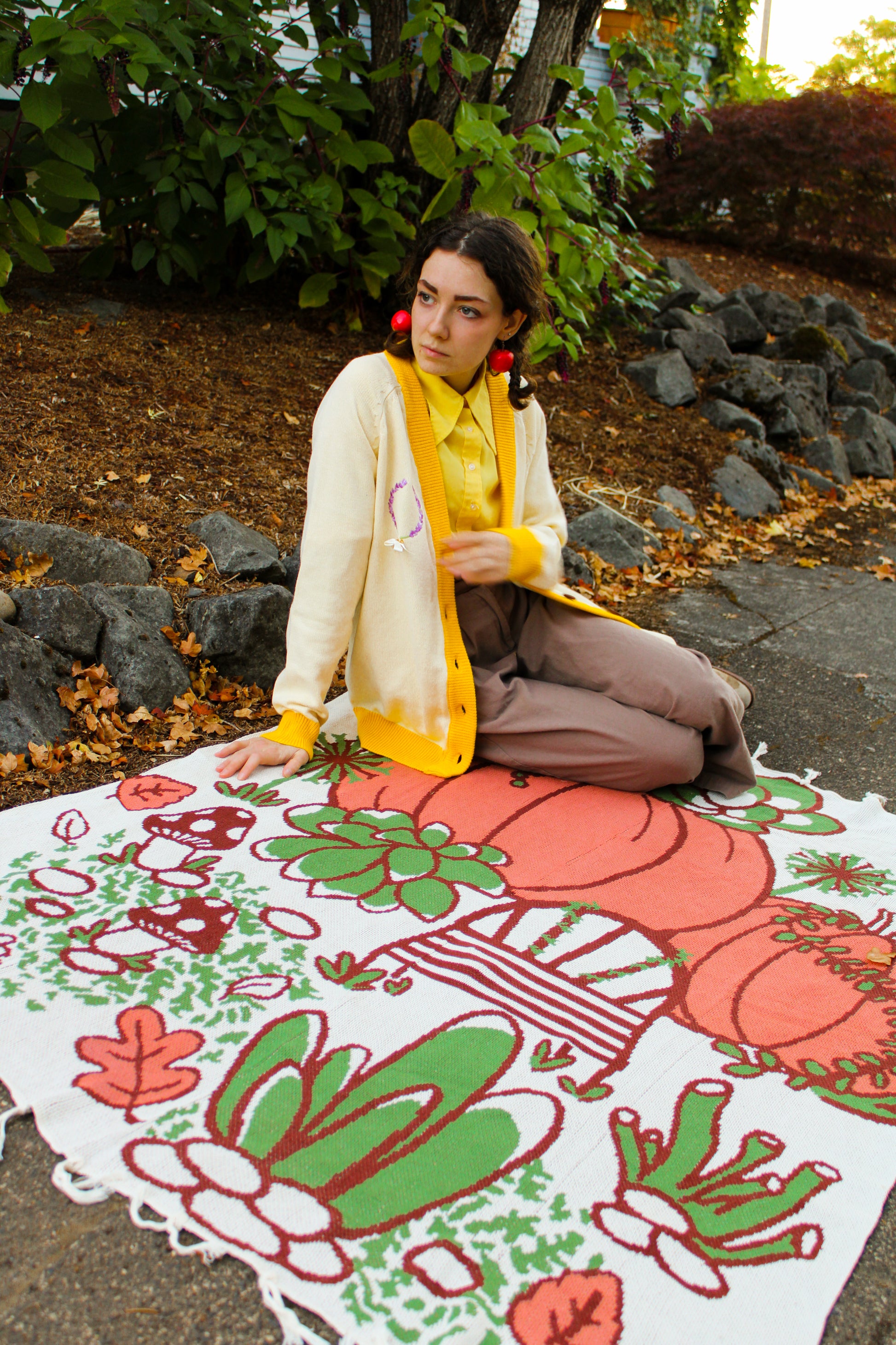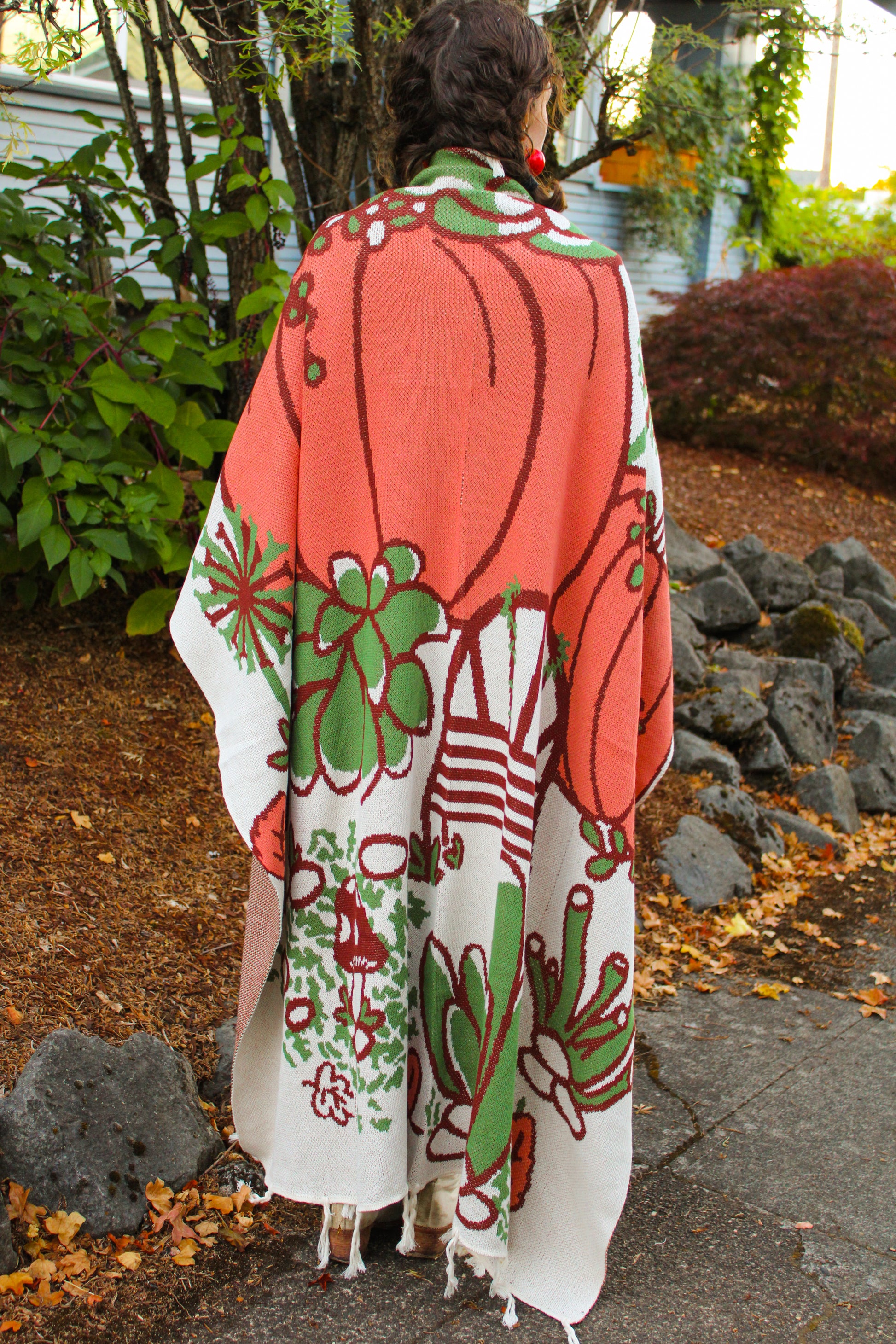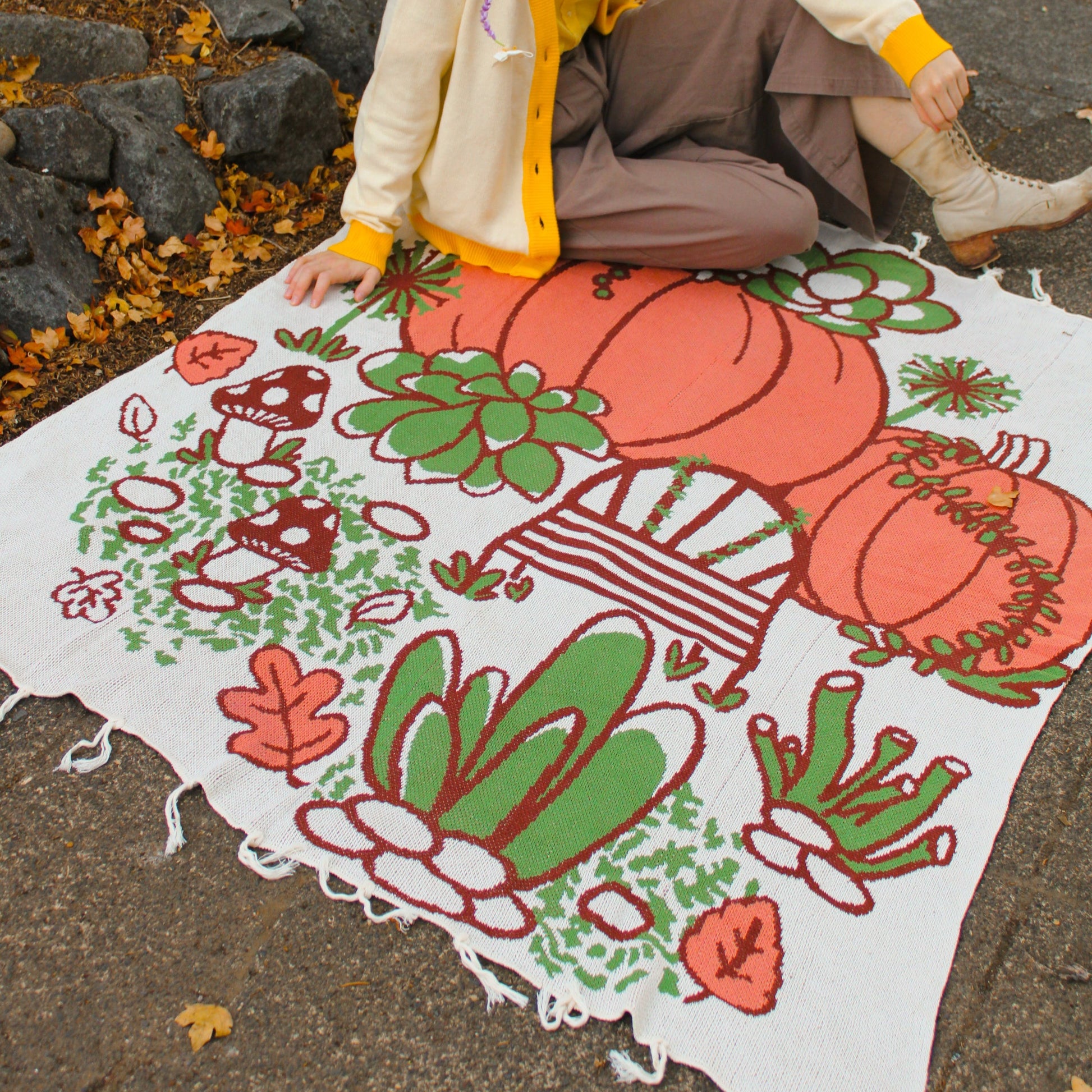Super soft and cozy knit throw blankets with an original illustration of pumpkins, mushrooms, autumn leaves and succulents.