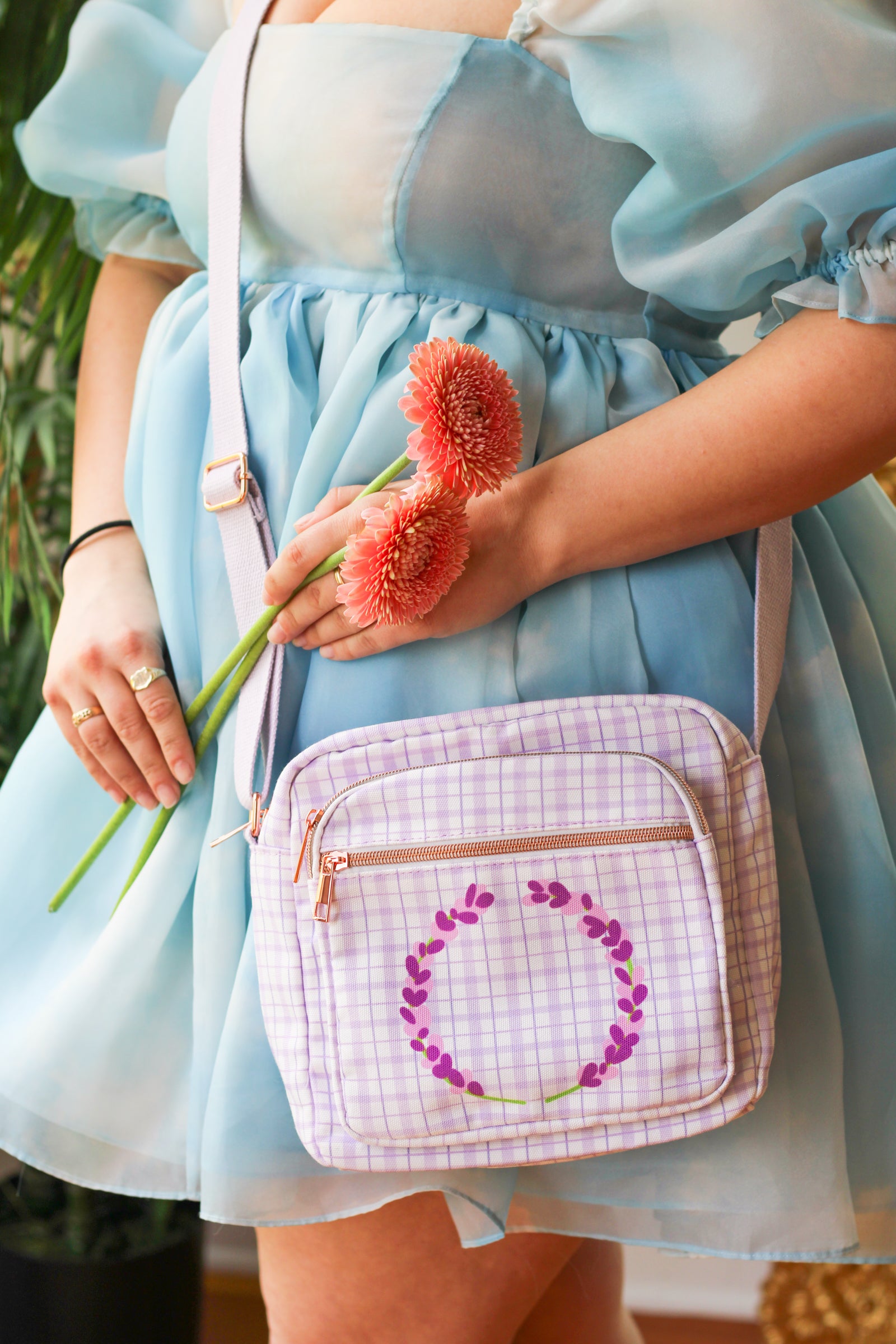 Features a smooth pastel lavender-colored strap with rose gold adjustment buckles, plus rose gold zippers and pulls throughout the bag. Shell and interior all 100% cotton. Outside is not waterproof like our fanny packs, but are durable and will not stain easily!