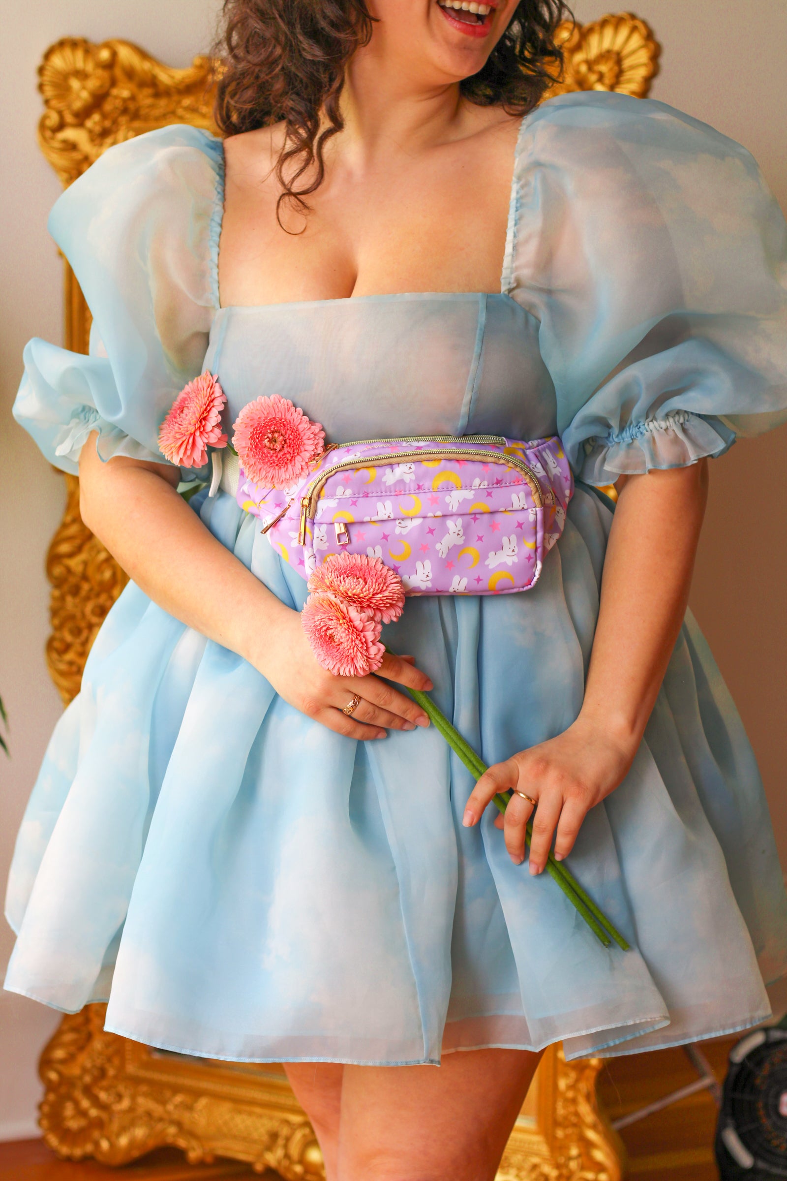 The Moon Bunny fanny pack is so cute, and fits all my essentials, leaving my hands free. I love the design and especially the main color. I like to wear it across my chest. The fit is snug, but still comfortable.