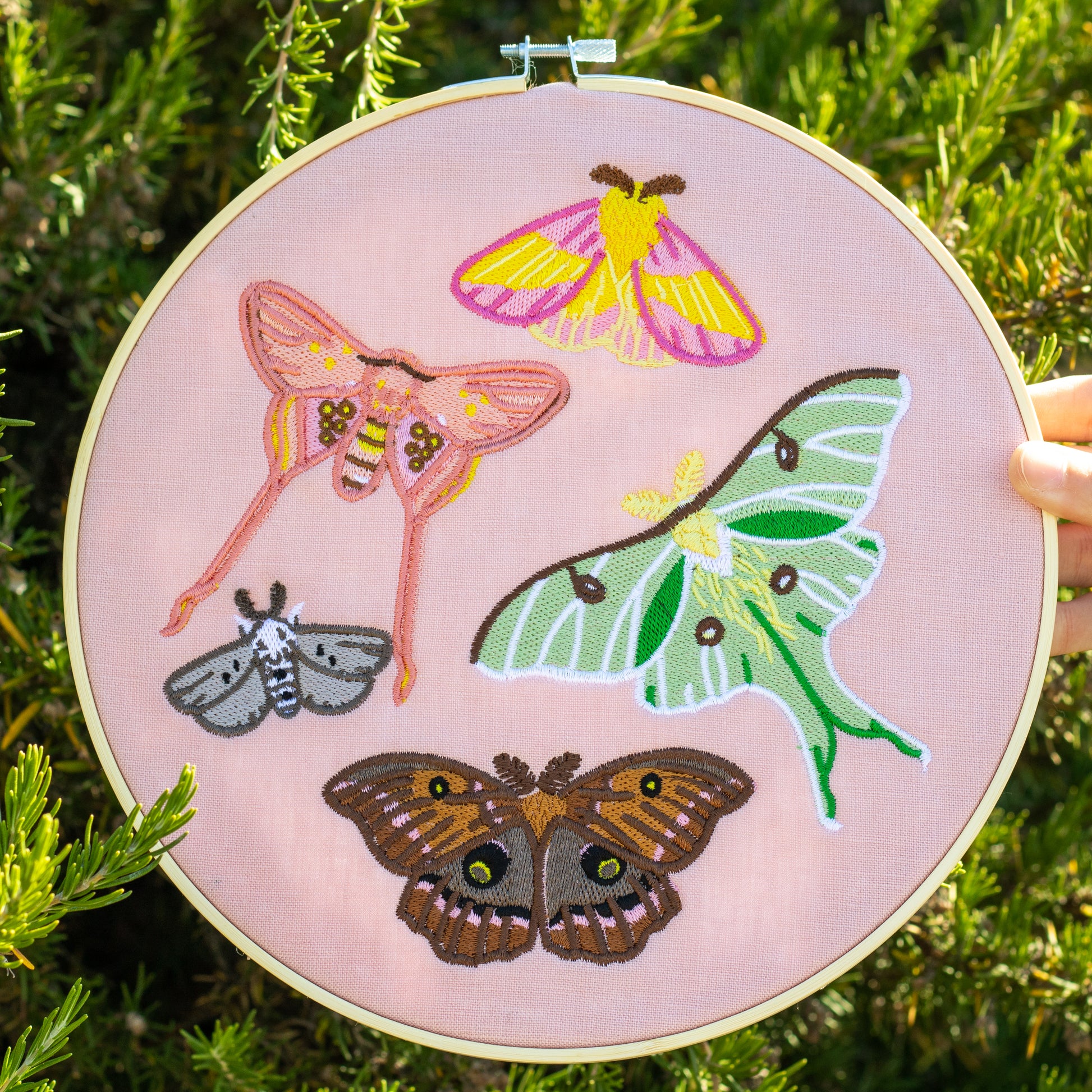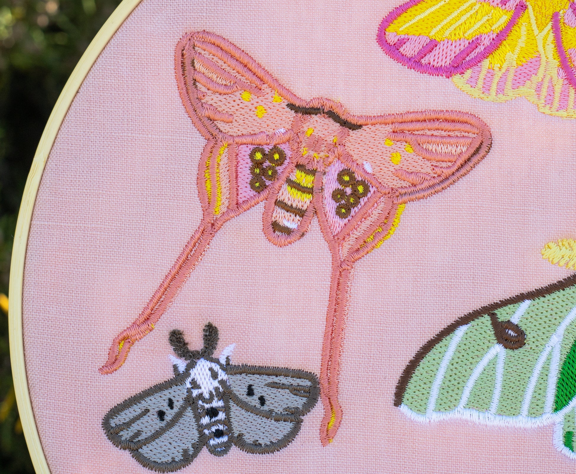 A 10" embroidery hoop featuring our Pastel Moths. Machine embroidered on a base of felt and a top layer of pink linen. Back features a Clammy Heart tag and a ribbon for hanging.