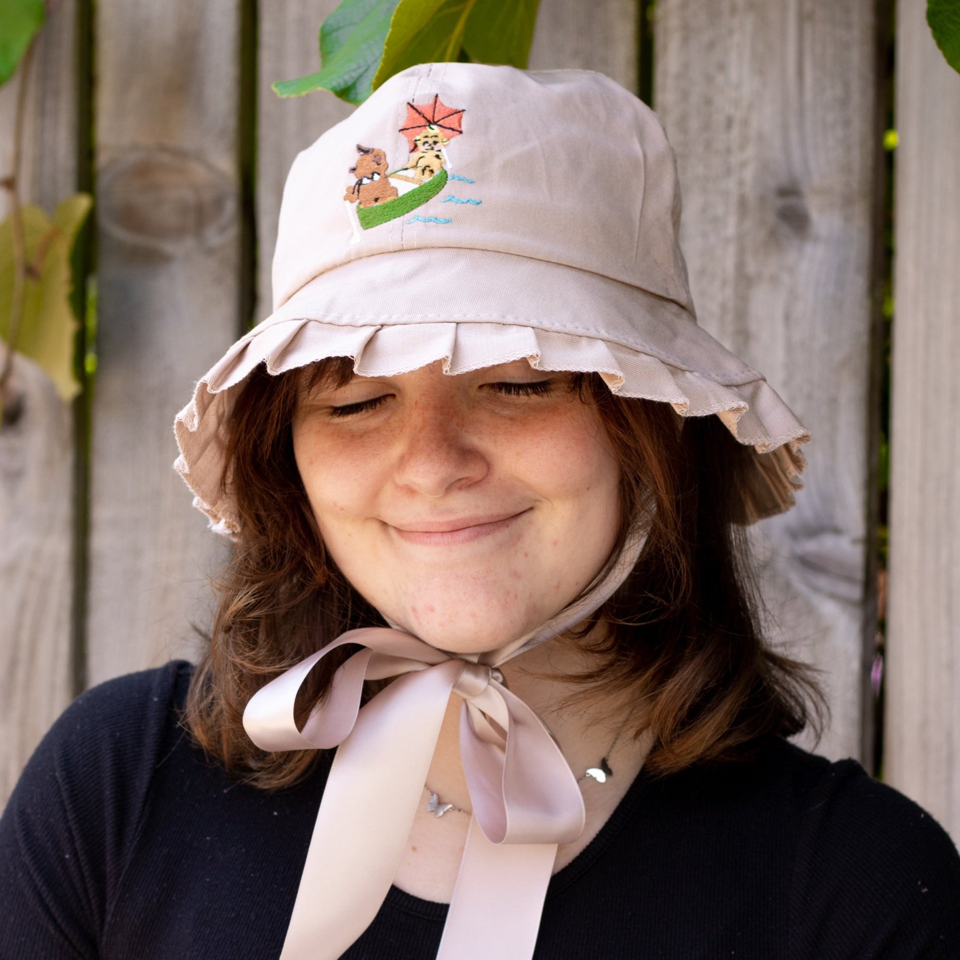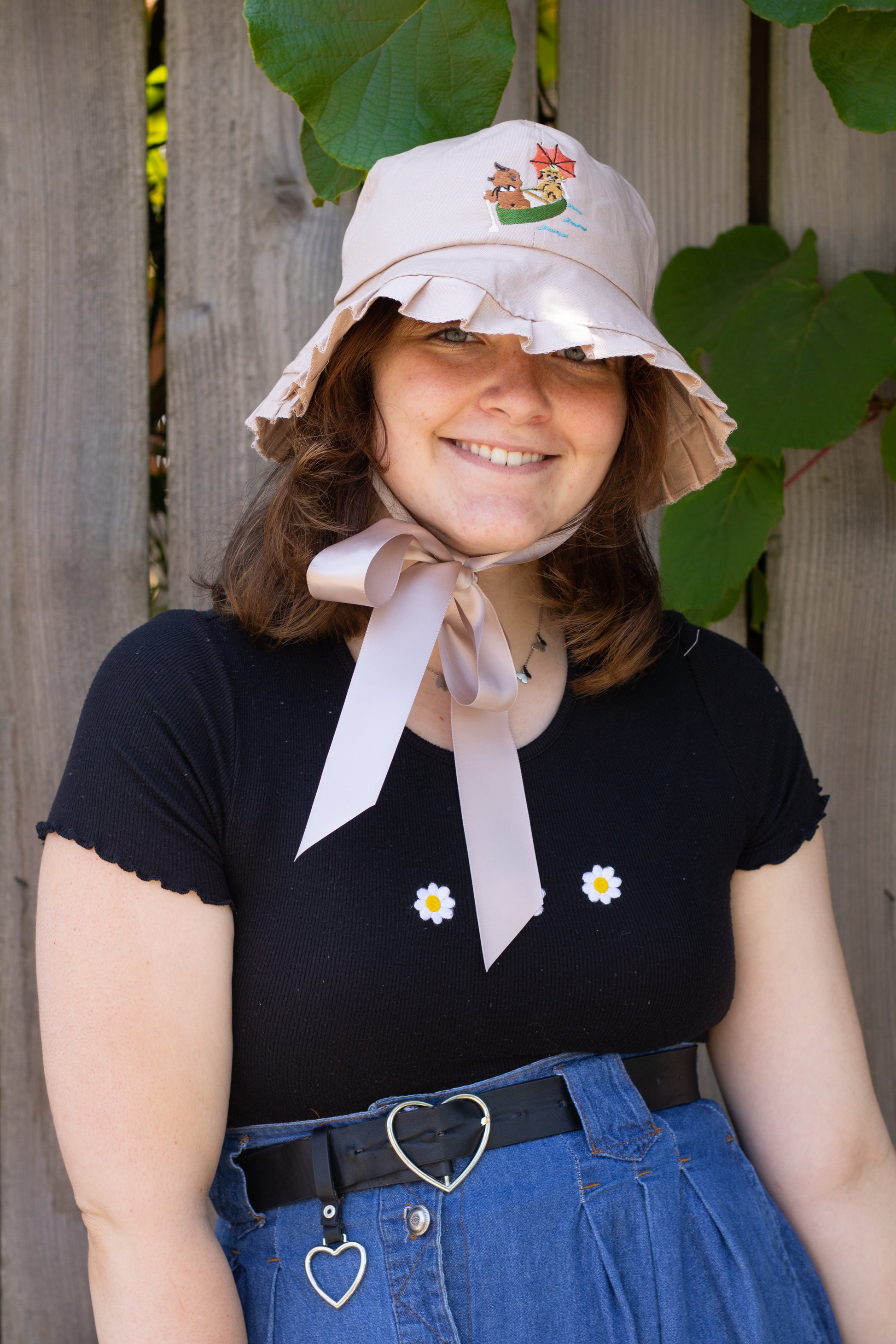 Hat circumference is 22.5 inches and will fit most heads. Lightweight fabric with no lining. 100% cotton with a long satin ribbon that can be tied in a bow or a knot at the chin!