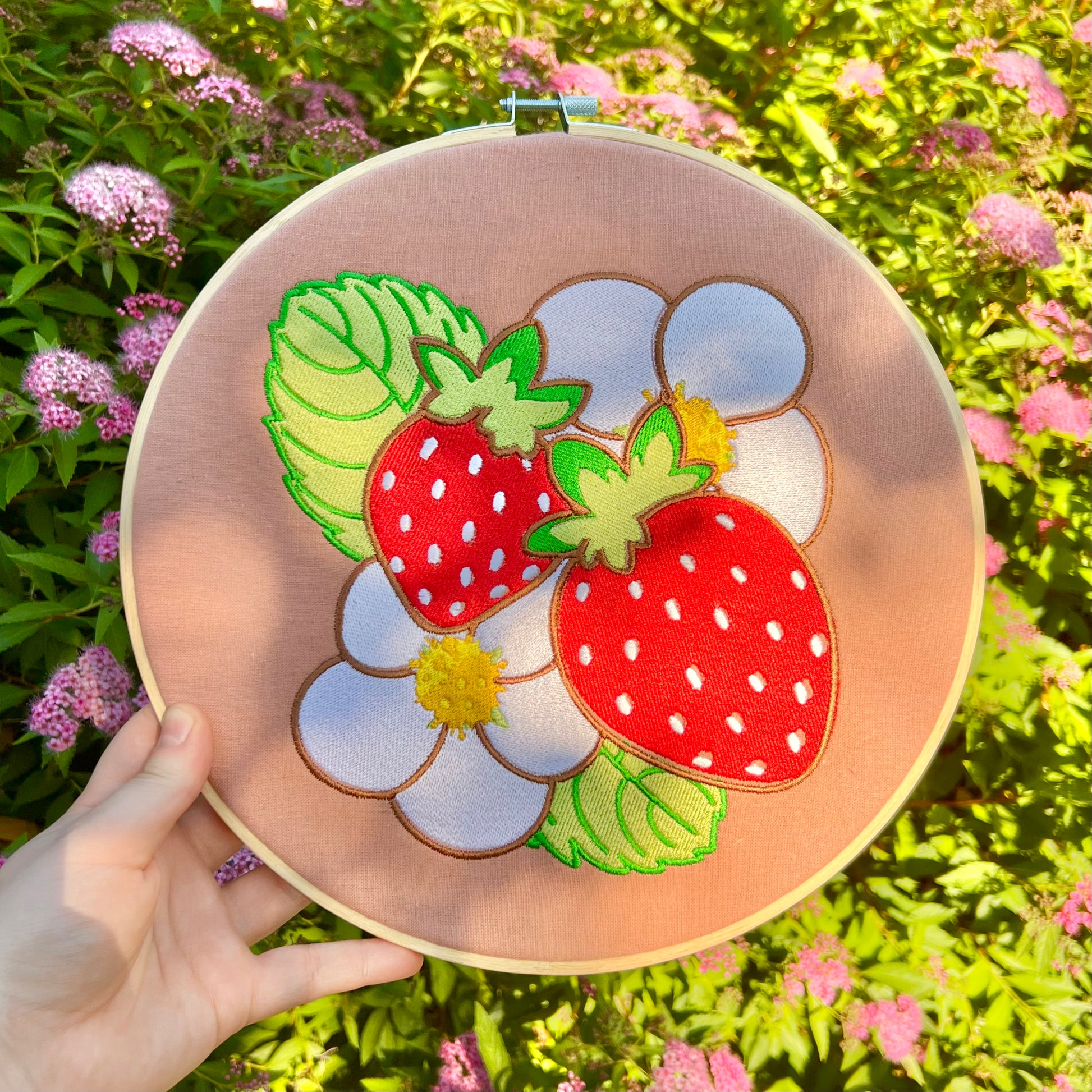 A 10" embroidery hoop featuring strawberry blossoms! Machine embroidered on a base of felt and a top layer of cream linen. Back features a Clammy Heart tag and a ribbon for hanging.