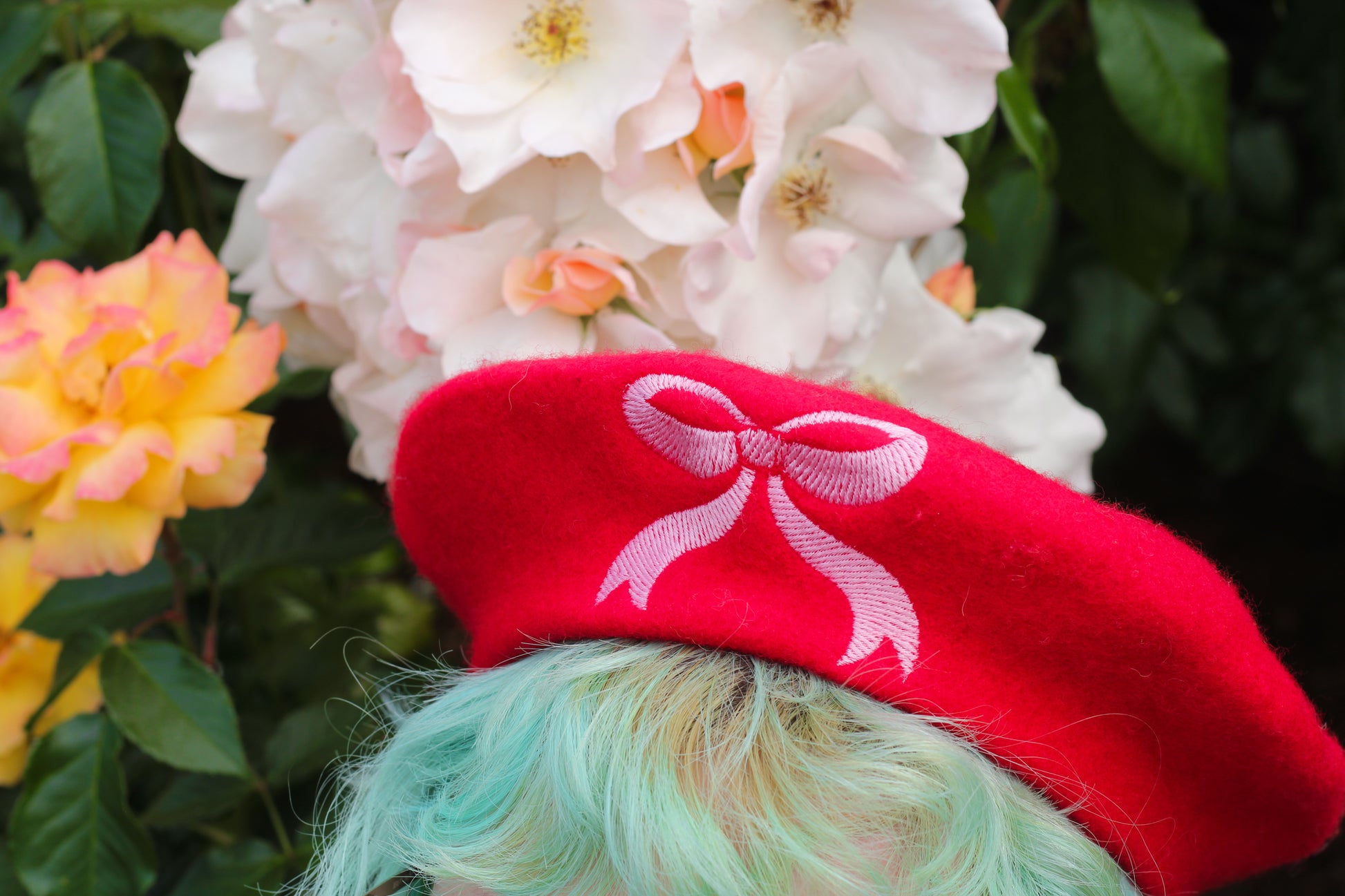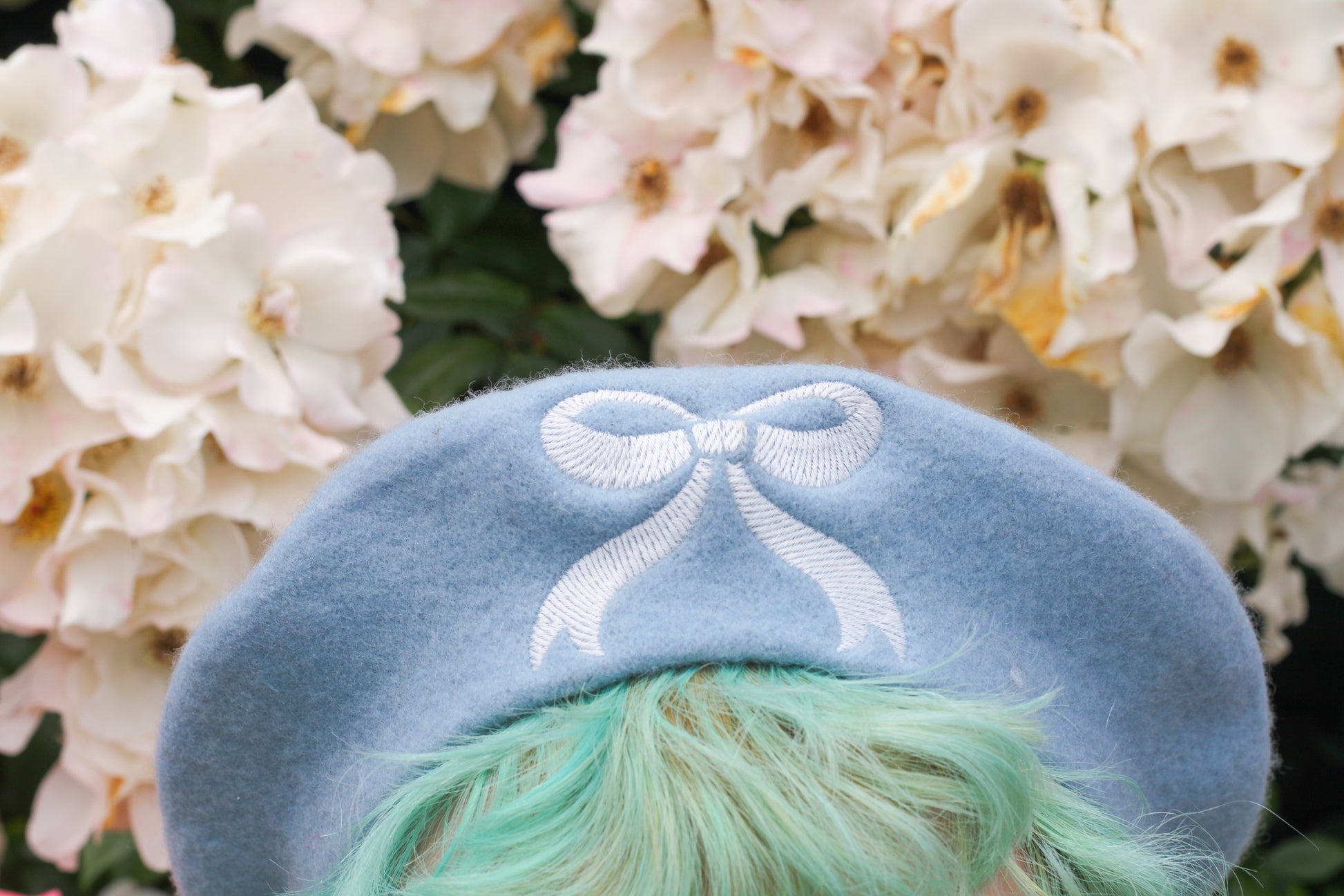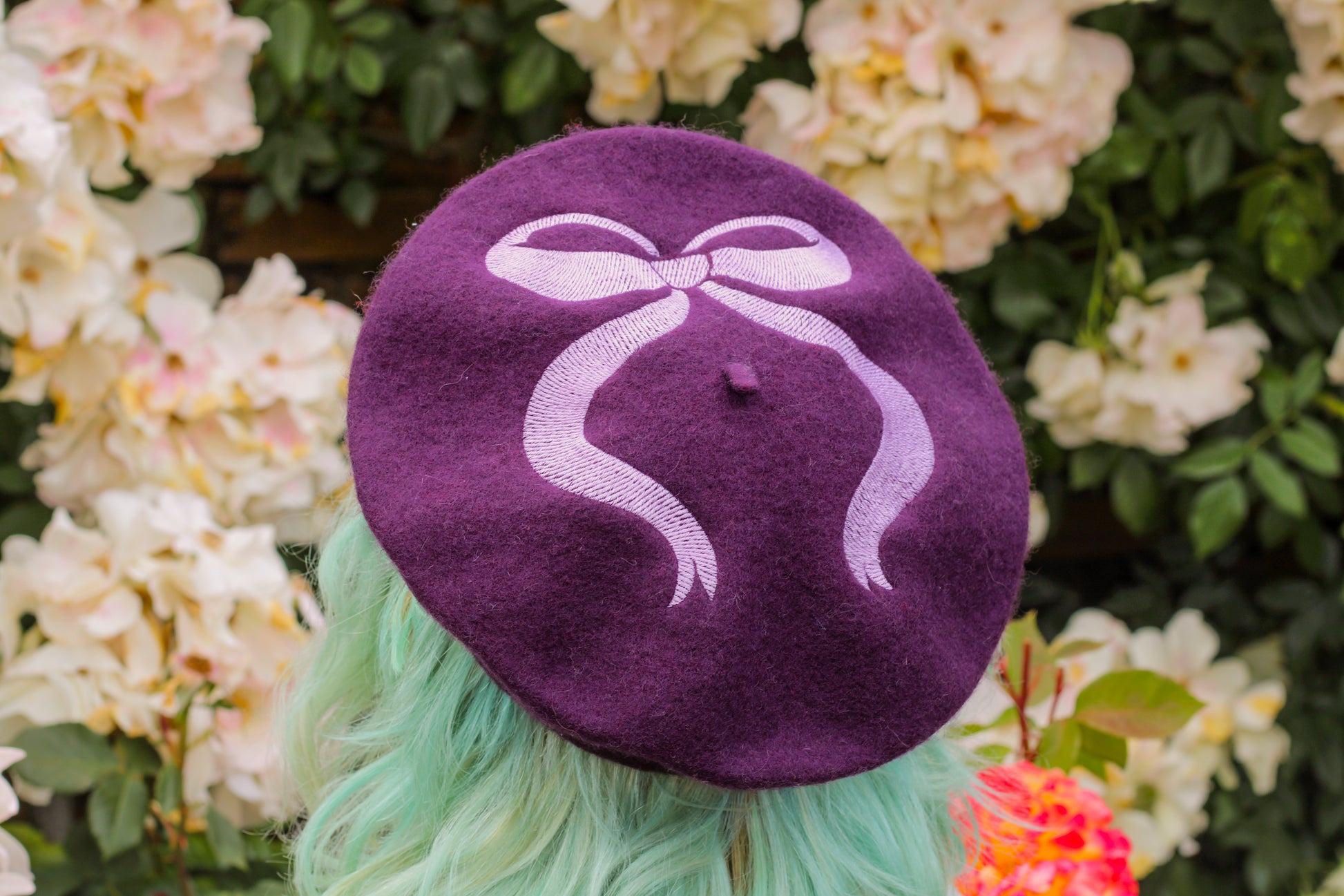 Photos include the following color combinations: Marzipan x Black, Candy Apple x Pastel Pink, Dark Chocolate x Pastel Pink, Juniper x Cream, and Blackberry Jam x Lilac. If you would like to order another beret color, please let us know your preference for the THREAD too! Be as specific as you'd like, and I will use the thread your heart desires!