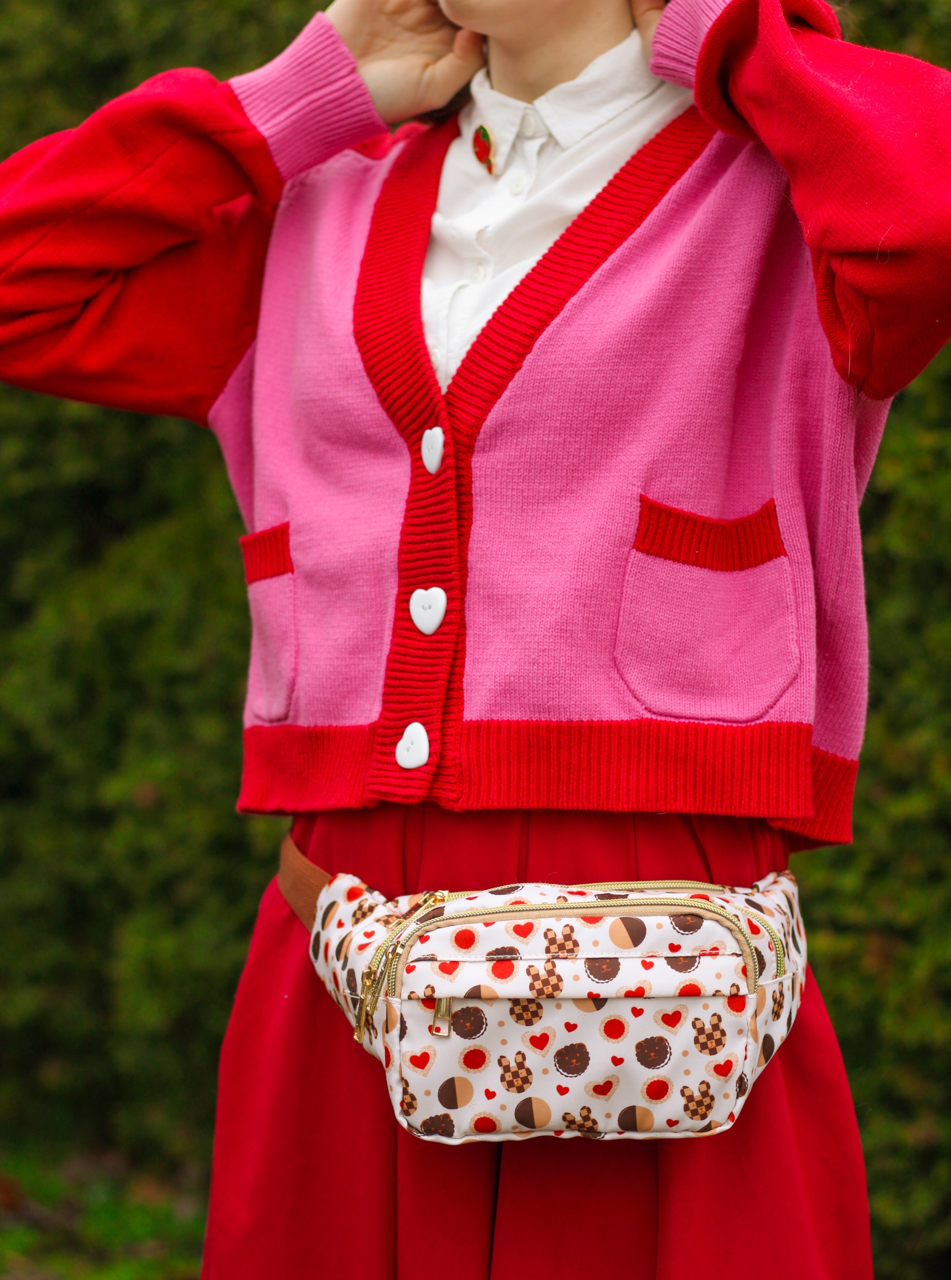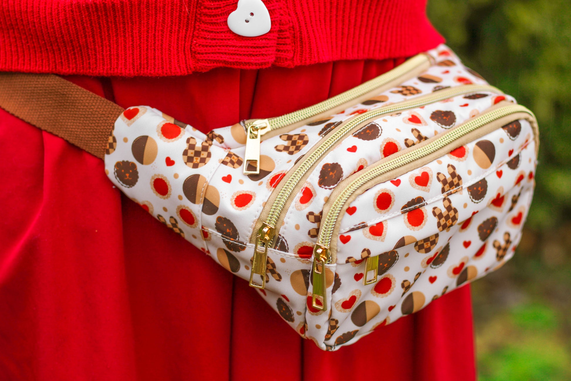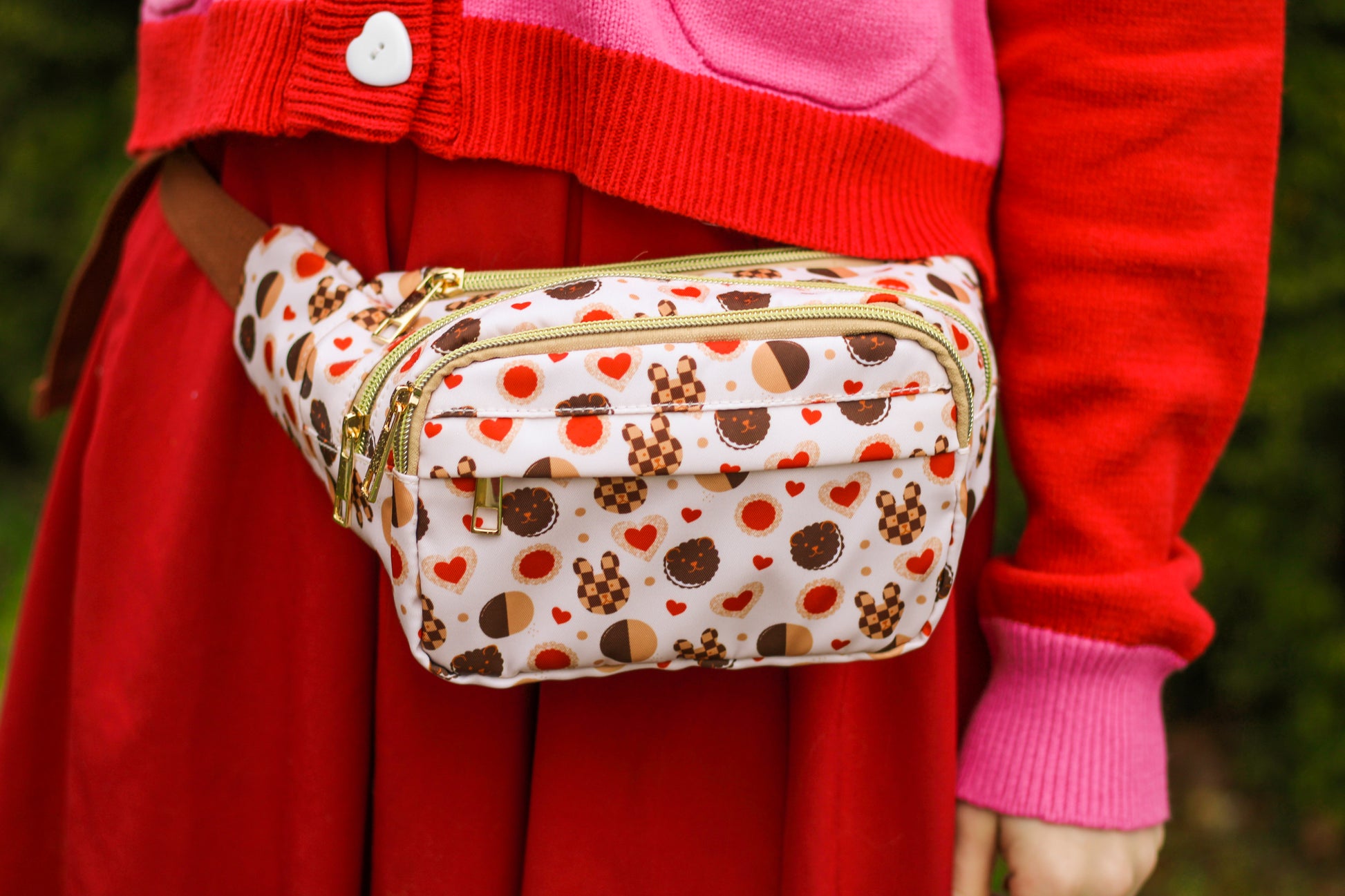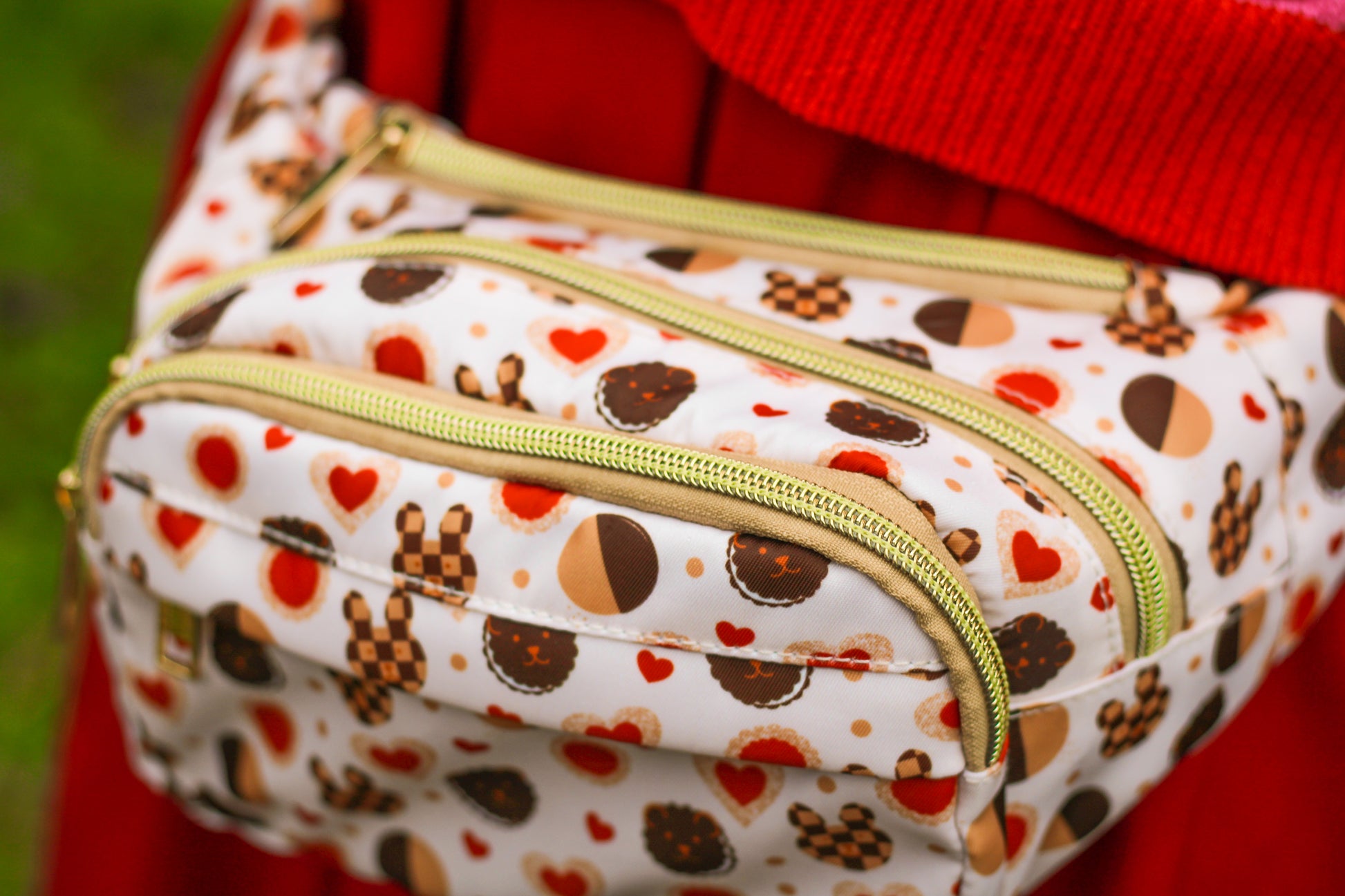 Fanny packs featuring our cookie bear and bunny designs! These packs are vibrantly printed, durable 100% polyester fabric. The fabric is waterproof, but the zippers are not. Texture is a bit slick, like a smooth canvas. Each design features cotton straps that extend up to 53”. Can be worn around the waist or hips, or across the chest. Fits a regular Nintendo Switch or Switch Lite console, phone, pencil pouch, notebook, etc. There are four separate zippered compartments!