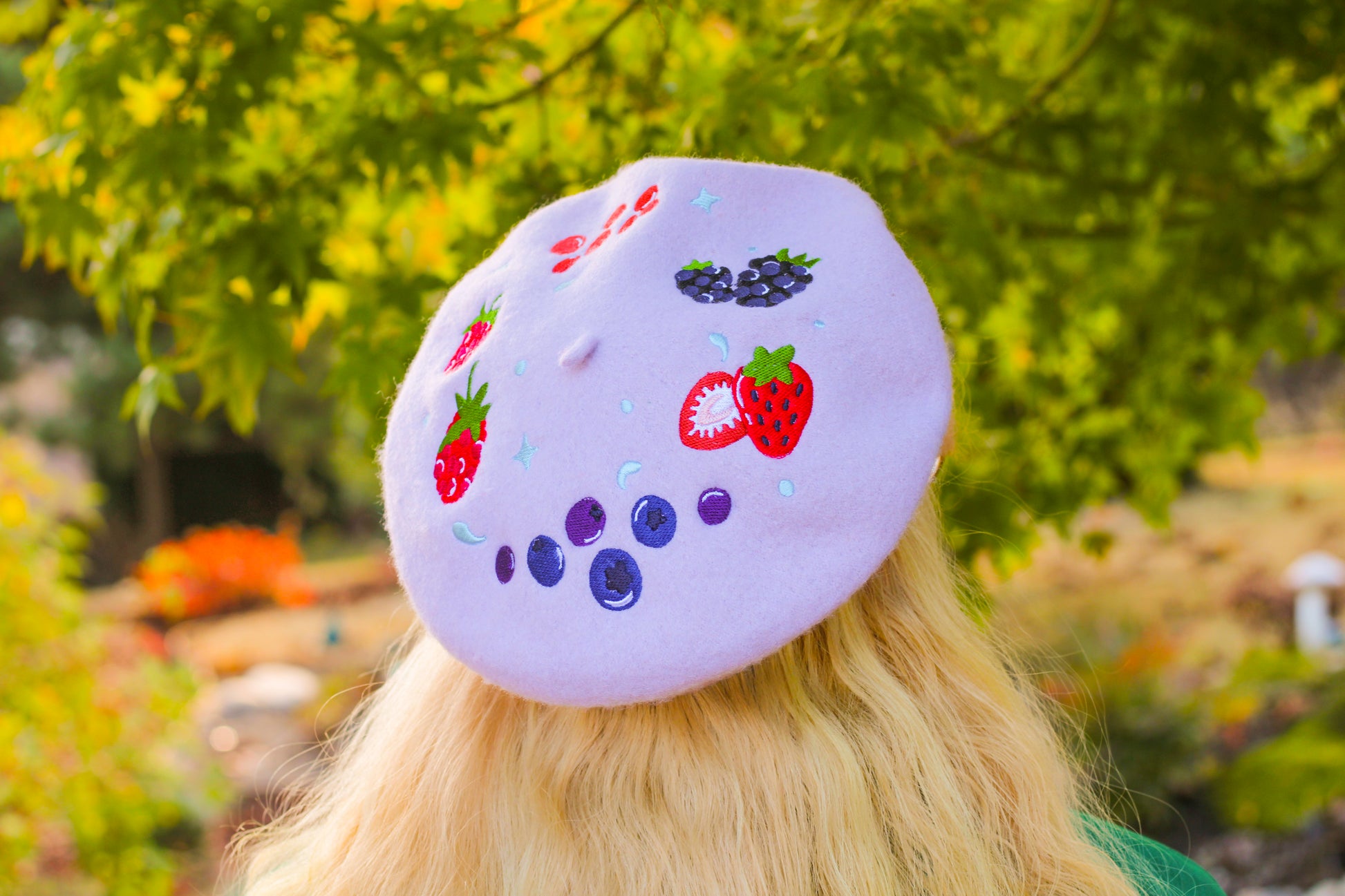 Summer sweets are year-long with this yummy mixed fruit smoothie beret! A blend of raspberries, blackberries, strawberries, blueberries, and cranberries, complete with metallic icy blue embroidered accents.